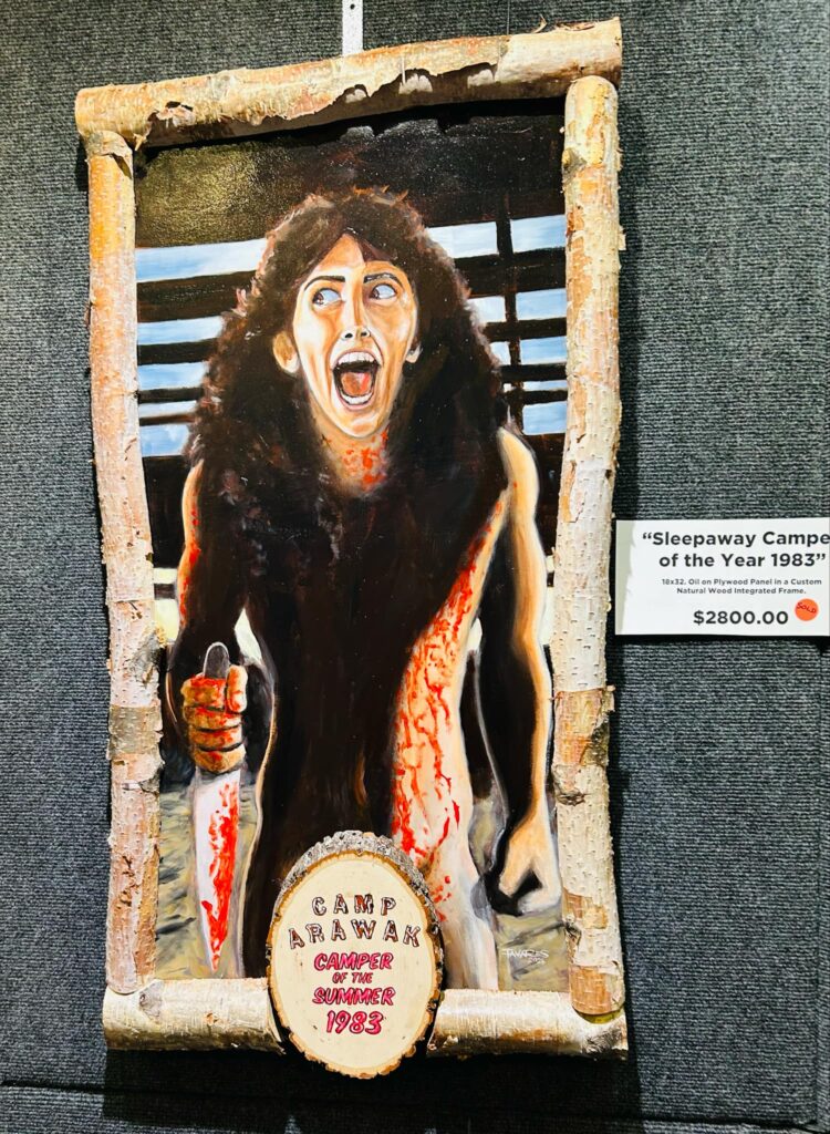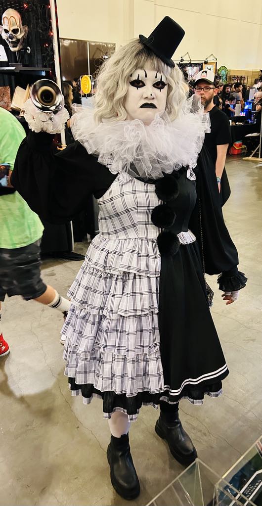 2025, Terrifier 3 and its mime-like mascot “Art the Clown” served as a centerpiece at the popular horror con May 30-June 1 (held at the Pasadena Convention Center, Pasadena, CA), seen in just about every art form, including T-shirts, posters, paintings, stickers, patches, mannequins, action figures, blow up dolls, buttons, hats, cosplay and, oh yes, tattoos. More thrilling was the attendance of T3’s writer/director Damien Leone and his accomplice, David Howard Thornton (aka “Art the Clown”) mixing it up with MP’s guests the entire weekend and happily accommodating the hour-long lines of Terrifier groupies with a signature, photo and/or conversation.